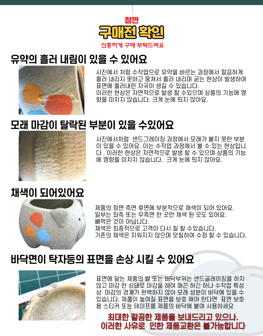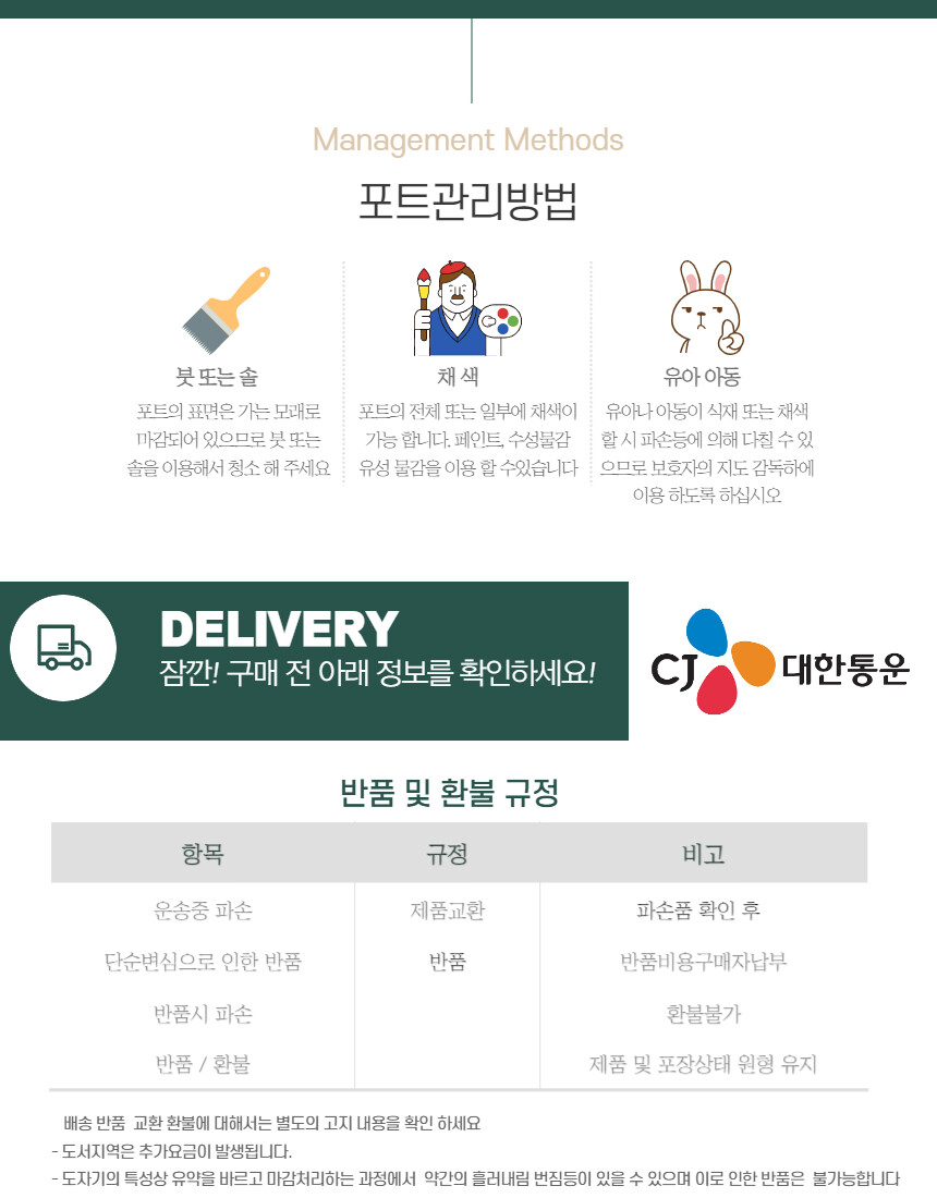 - 제품 특성상 단순 변심, 부주의에 의한 제품 손상 및 파손, 사용 및 개봉한 경우 교환/반품이 불가합니다.