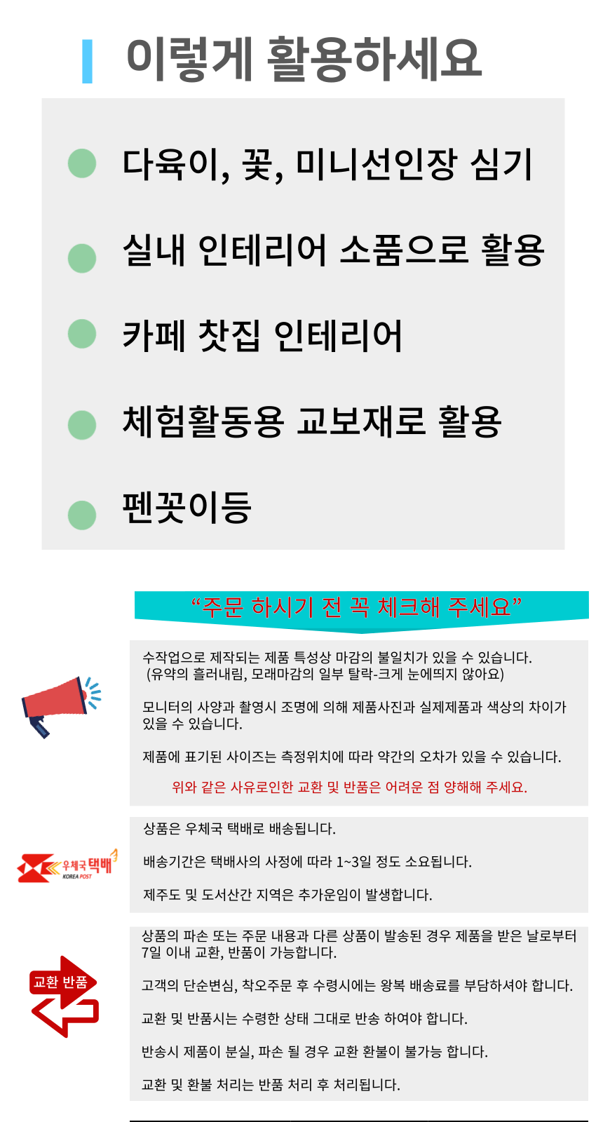 - 제품 특성상 단순 변심, 부주의에 의한 제품 손상 및 파손, 사용 및 개봉한 경우 교환/반품이 불가합니다.